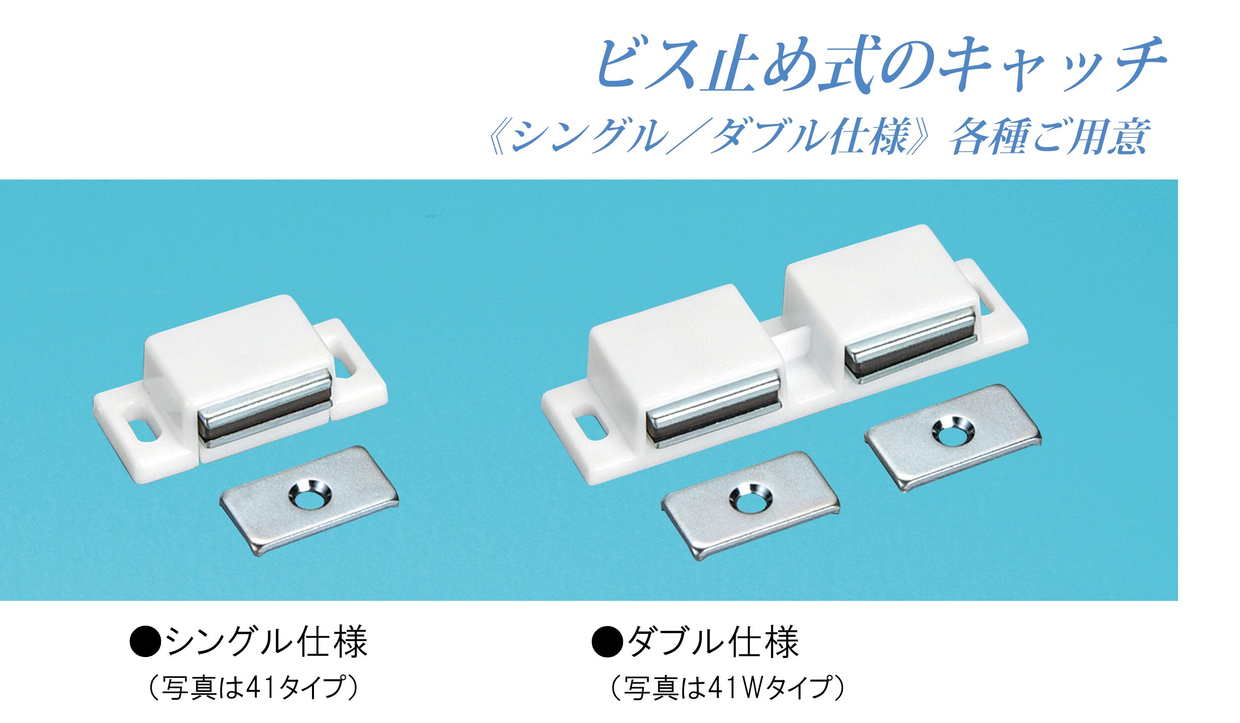 マグネットキャッチ/ローラーキャッチ/キャビネット丁番をご用意。