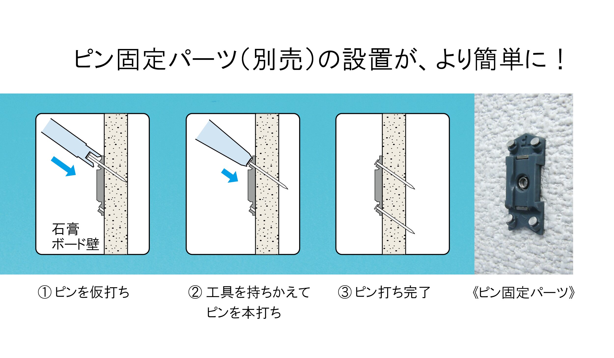 ピン打ち工具 押込んでピン打ちするタイプなので安全 製品仕様/特徴 ピン打ち工具 押込んでピン打ちするタイプなので安全です。・・・誤ってハンマーで手や壁を叩く心配がありません。 小型ハンマー等でもピン打ち可能ですが、コレを使うと『より簡単に・素早く・確実に』ピン打ちできるのでとても便利です。 品番材質・色1袋外箱入数CC‐912PP樹脂 ホワイト1個100袋 閲覧資料:下のボタンをクリックすると閲覧できます。 図面PDF 図面DXF カタログページ